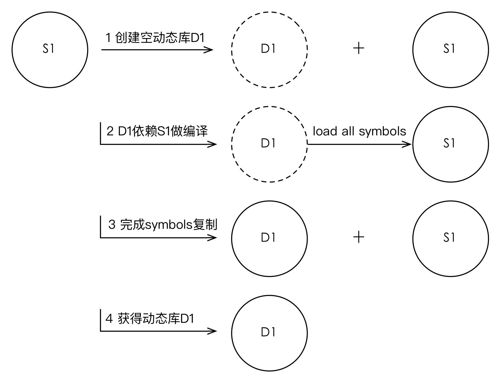 步骤示意图:(S1 表示静态库,D1 表示动态库)