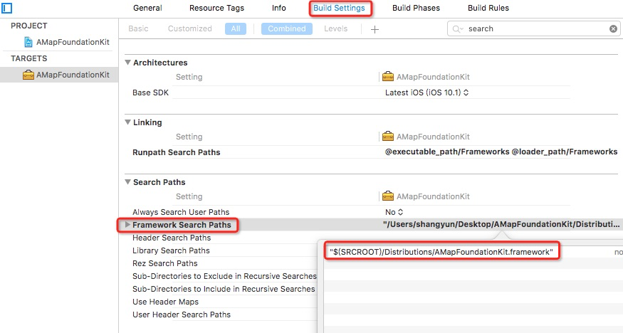 设置Framework搜索路径,在AMapFoundationKit -> Build Settings -> FRAMEWORK_SEARCH_PATHS设置成静态库的路径