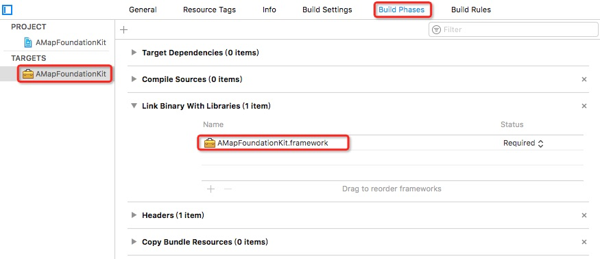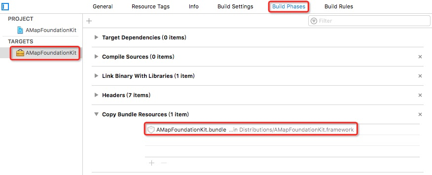 将静态库中的所有资源拖到AMapFoundationKit -> Build Phases -> Copy Bundle Resources