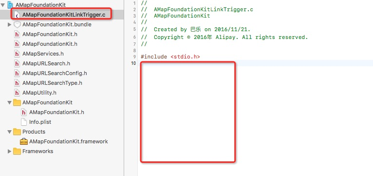 可以从Xcode原生的动态库模版一个空的动态库,与静态库名称相同,即AMapFoundationKit。