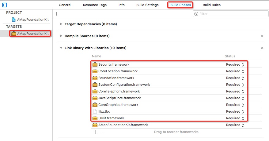 将静态库framework的所有系统库的依赖添加进来,可根据编译时symbol未找到symbol报错,依次添加到AMapFoundationKit -> Build Phases -> Link Binary With Libraries